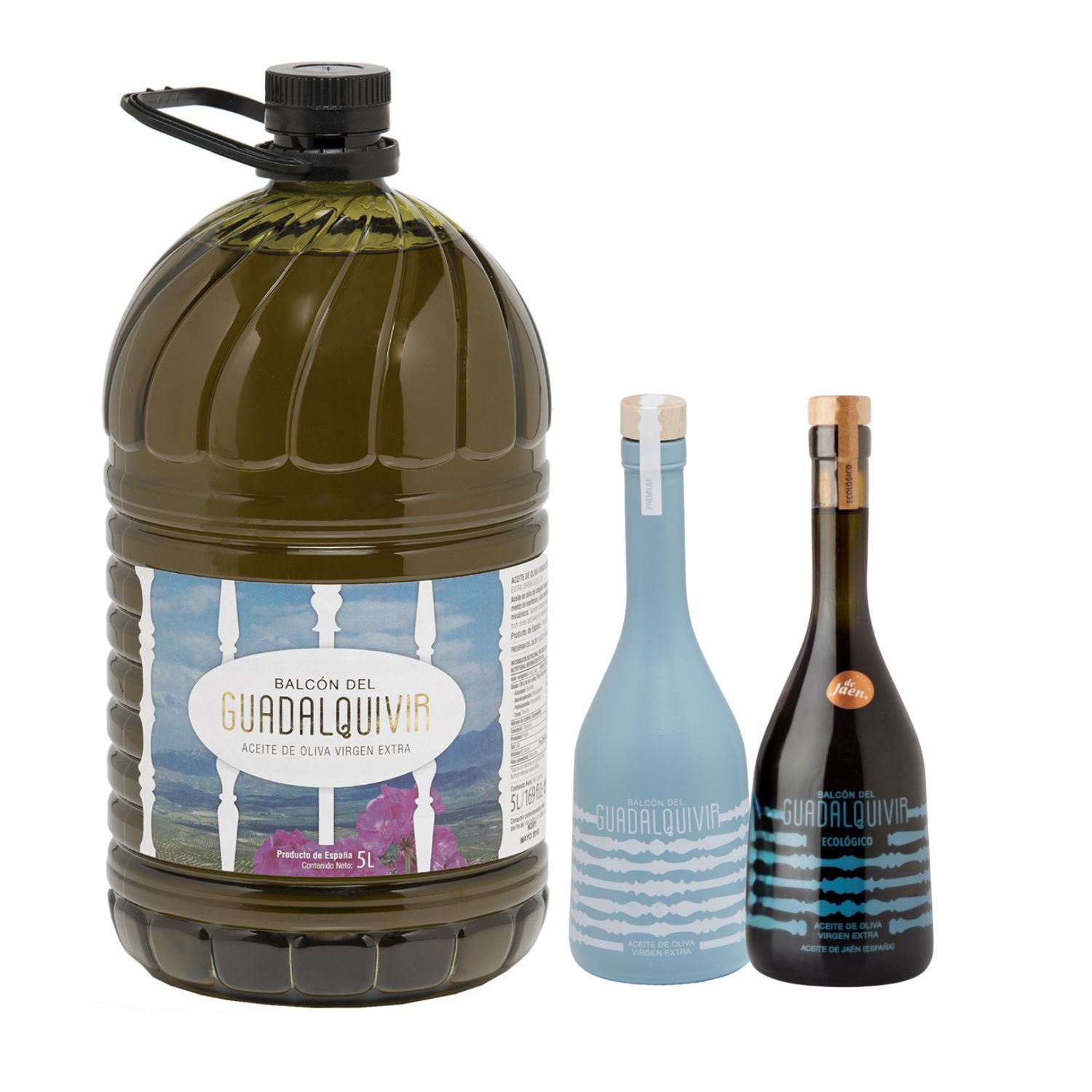 Garrafa de 5 Litros AOVE Reserva Familiar + 1 botella de aove premium 500 ml + 1 botella de aove premium ecológico 500 ml